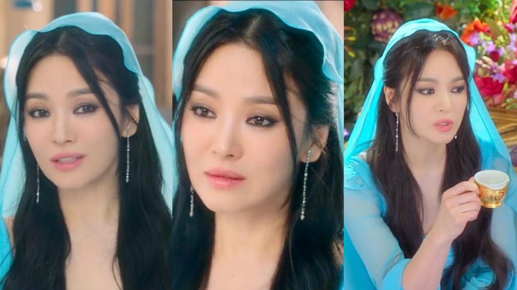 Song Hye Kyo berhasil mencuri perhatian ketika tampil sebagai cameo di Genie Make a Wish. Dalam serial ini, ia memerankan Jinniya yang memiliki hubungan masa lalu dengan Iblis. Song Hye Kyo tampil memukau dengan busana elegan berupa gaun dan tudung kepala biru aquamarine yang menonjolkan aura magis karakternya. Riasan smokey eyes dan lipstik merah muda membuat penampilannya semakin dramatis dan menawan. Song Hye Kyo muncul di episode 8 dan episode 10, dan setiap adegan yang menampilkan dirinya selalu menjadi sorotan. Kehadiran cameo ini memperkuat daya tarik drama dan menambah unsur misteri serta romansa dalam cerita. Penampilan artis cantik ini menjadi pembicaraan hangat di media sosial karena kombinasi busana dan chemistry yang terlihat dengan karakter Kim Woo Bin.